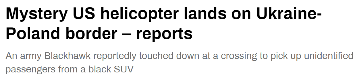 FX168财经报社(香港)讯 据“今日俄罗斯”电视台网站报道,当地时间15日午夜时分,美国陆军一架神秘的黑鹰直升机抵达波兰与乌克兰边境,随后从一辆来源不明的黑色SUV上接走几名乘客。