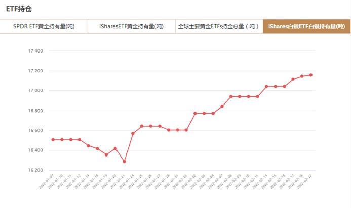 iShares白银ETF2月22日白银持有量为17156.59吨,与上一交易日增加11.5吨。
