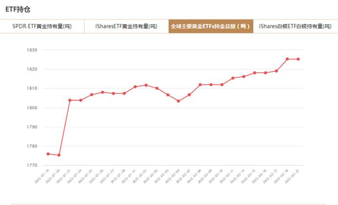 根据黄金信息网站www.24K99.com对全球8大主要黄金ETF的监控数据显示,截至2022年2月22日,全球8大黄金ETFs持仓总量为1825.217吨,与上一交易日持平。