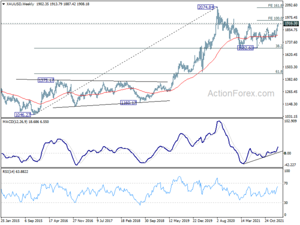 ActionForex并表示,需要指出的是,首先,假如持续突破1916.30美元/盎司,这应会证实金价从2074.84美元/盎司(2020年最高价)开始的整体修正已经在1682.60美元/盎司完成,从周线图来看,这一水平也是金价自1046.27美元/盎司至2074.84美元/盎司升势的38.2%斐波那契回撤位。