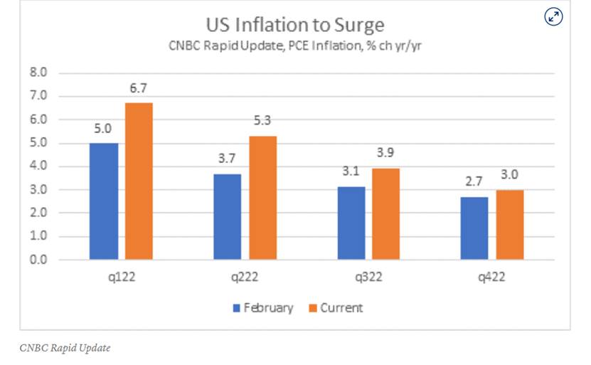 美国消费者新闻与商业频道(CNBC)对美国经济的14项预测的平均数据显示,今年美国GDP将增长3.2%,较2月份的预测略有下调0.3%,但仍高于趋势增长,因为美国继续从奥密克戎(Omicron)的放缓中复苏。美联储偏爱的通胀指标——个人消费支出今年预计将上升4.3%,比2月份的前一次调查高出0.7个百分点。