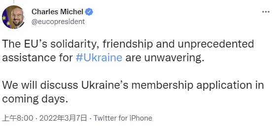 FX168财经报社(北美)讯 欧洲理事会主席查尔斯·米歇尔周一(3月7日)在推特上表示,乌克兰加入欧盟的请求将在“未来几天”进行讨论。
