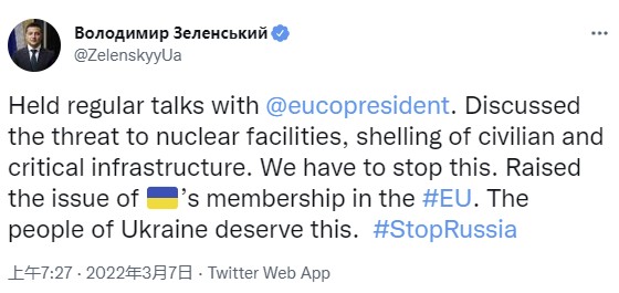 与此同时,乌克兰总统泽连斯基也在推特上发布了他与米歇尔通话的消息。