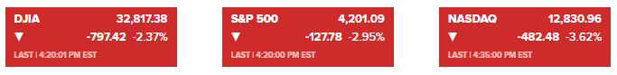 道琼斯指数收盘下跌797.42点或2.37%,收于32817.38点,受到美国运通下跌近8%的拖累。标普500指数下跌2.95%,至4201.09点,进一步进入回调区间。该股指已较其历史收盘点位低出12%以上。纳斯达克综合指数下跌3.62%,至12830.96点,目前处于熊市区域,已较历史收盘点位下跌20%以上。