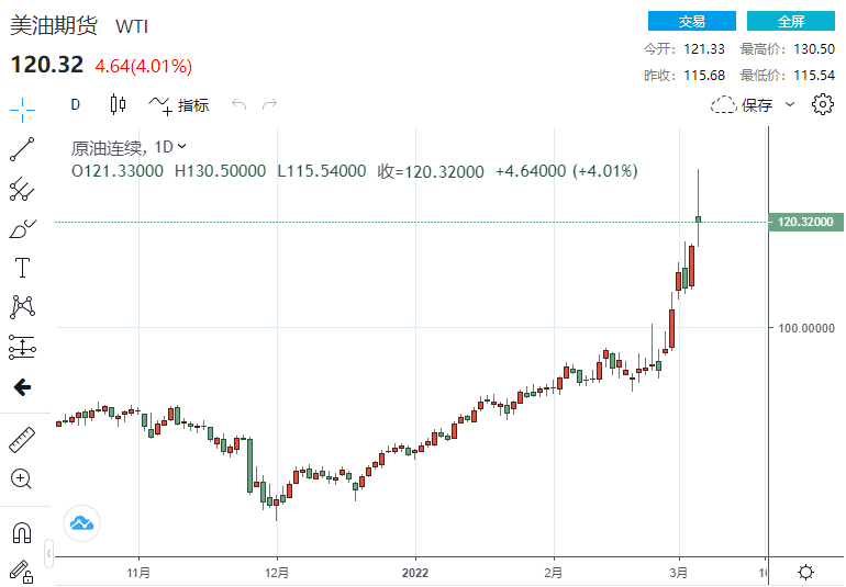 截至发稿,美国WTI原油期货上行5.23美元,涨幅4.55%,现报120.17美元/桶;布伦特原油期货上探6.07美元,涨幅5.15%,报124.06美元/桶。盘中布伦特原油触及每桶139.13美元,WTI 原油触及130.50美元。