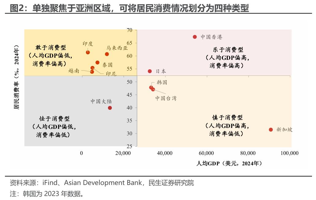 (3) 怯于消费型(对应人均GDP偏低、消费率同样偏低的地区,如中国大陆):现阶段发展水平与消费率还存在提升空间(传统经济增长引擎并非在于消费),未来或通过一系列举措激发消费潜力、迈向消费升级的新阶段;