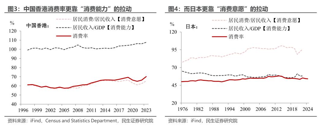 同是消费“优等生”,中国香港与日本的“解题思路”大相径庭。若继续沿用报告中“消费率=(居民消费/居民收入)×(居民收入/GDP)=消费意愿×消费能力”的分解框架,我们可以发现虽然中国香港与日本均具备人均GDP较高且消费率领先的共性,但聚焦其消费率的主要拉动因素,可以发现它们的“促消费”路径截然不同——中国香港凭借不断增厚居民的收入、为消费“扩容”;而日本则是保持居民消费能力基本稳定的情况下、致力于通过意愿唤醒为消费“赋能”。