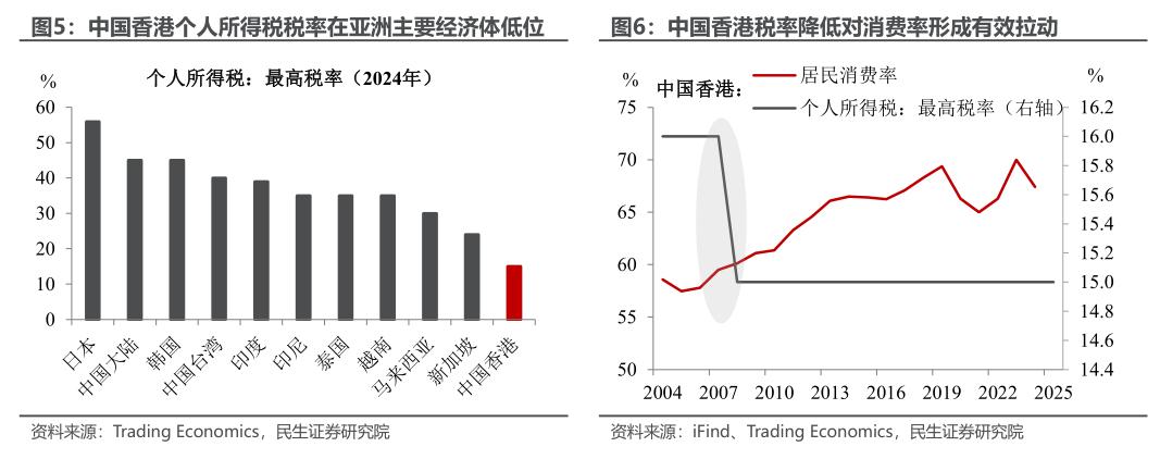 首先,中国香港的低税制环境对其消费繁荣功不可没。其税制设计极具竞争力:不设增值税、商品及服务税等流转税种,个人所得税则采用15%的标准税率或2%-17%的五级累进税率,在亚洲主要经济体中处于明显低位。