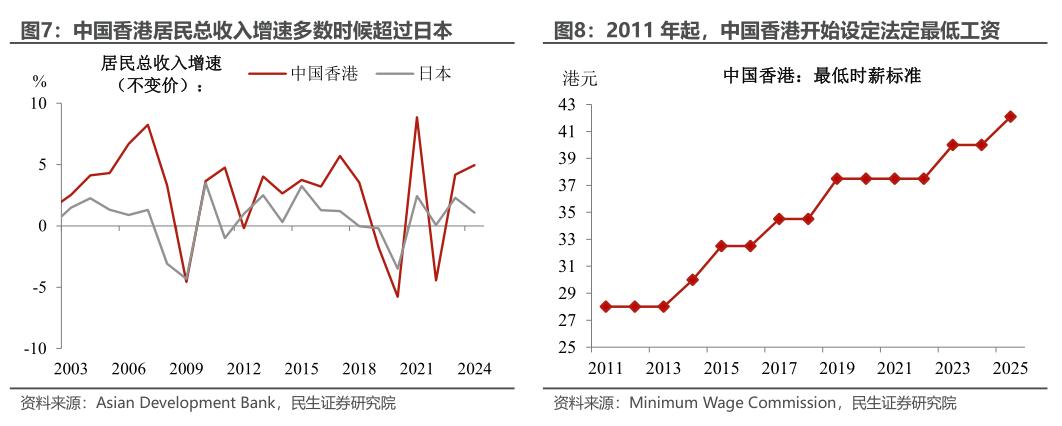 其次,香港消费活力的另一大支柱在于居民收入的持续“增厚”。与同属“乐于消费型”的日本相比,中国香港的实际居民收入增速长期保持领先地位,为消费扩张奠定了坚实基础。当然,这一优势离不开特区政府的政策呵护。比如2011年中国香港实施最低工资立法,将时薪标准设定在亚洲偏高水平,这一制度性变革“立竿见影”——居民消费率随即迈上新台阶、增长曲线明显陡峭,彰显了收入保障政策对消费提振的杠杆效应。