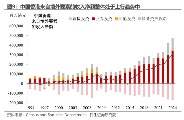 第三,中国香港居民的财富积累不仅体现在本地收入,更彰显于其卓越的全球资产配置能力。数据显示,中国香港来自境外要素的收入净额持续攀升,其中证券投资收益表现尤为亮眼,成为推动香港居民收入高速增长的另一关键动力。