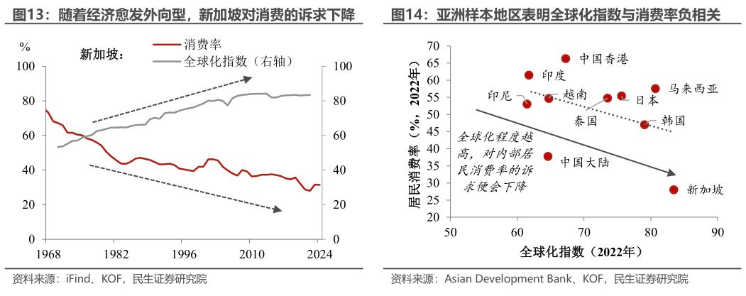 新加坡的经济发展轨迹,可以概括为“外向驱动,内需退位”。新加坡以其高度开放的姿态融入全球体系,随着全球化指数持续攀升,居民消费率却从高位逐步回落至当前的40%以下。当外循环成为经济增长的主引擎,内需消费则退居相对次要的位置,新加坡呈现出“内消外长”的显著特征。从更广阔的亚洲视野观察,这一规律同样水落石出:全球化程度越高的经济体,其对内部居民消费率的依赖程度往往越低。