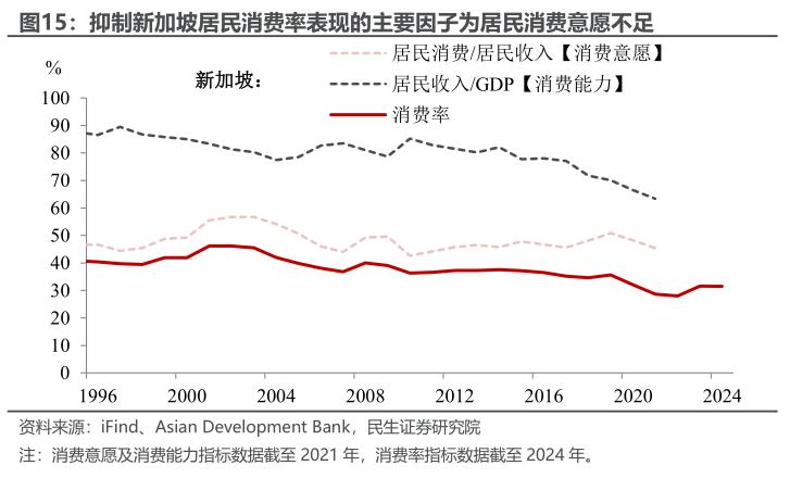 剖析新加坡消费生态,其核心特征可概括为“有钱却不花”。通过对新加坡居民消费率的拆解,可以发现拖累新加坡整体消费率的因素在于居民消费意愿较低。不过值得注意的是,近几年新加坡居民的消费能力也处于下行通道之中。