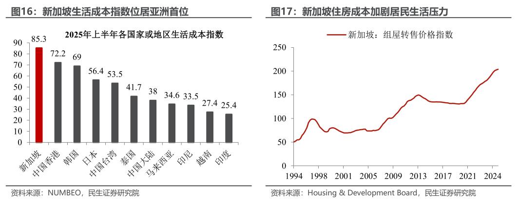 为何新加坡居民“有钱却不花”?一方面,新加坡居民面临高成本生活压力。受进口成本、高房价等结构性因素的影响,新加坡生活成本指数位居亚洲地区首位。尤其是空间及自然资源稀缺的“地理劣势”下,新加坡组屋转售价格指数持续攀升,迫使居民将更多收入用于应对住房等刚性支出,从而挤压了日常消费空间。