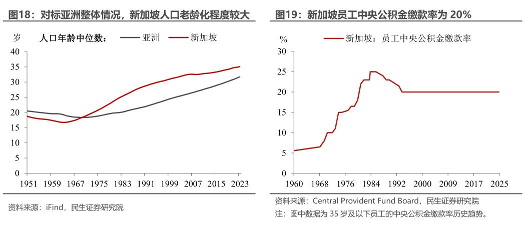 另一方面,新加坡人结构与制度设计形成了双重约束。新加坡人口年龄中位数已显著超越亚洲整体水平,老龄化趋势日益凸显。在这一背景之下,中央公积金制度要求雇员将工资的一部分强制纳入公积金账户(55岁以下员工最高可达20%),且近年来公积金强制缴纳的最高工资基数被持续上调,这意味着居民实际可支配收入受到显著压缩。