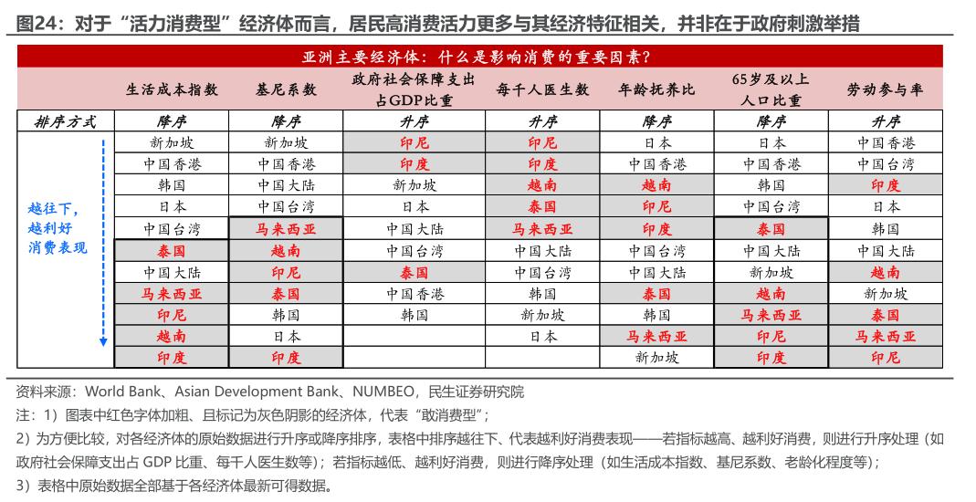 活力消费型经济体展现出一个鲜明特征:其消费活力的源泉更多来自社会内生动力,而非外部政策干预。它们普遍更具备年轻化的人口结构(老龄人口占比显著偏低),为消费市场注入了源源不断的“青春动能”。与此同时,这些地区的政府在社会保障领域的投入其实并不高(政府社会保障支出占GDP比重和每千人医生数等指标均处亚洲中下游水平),但即便在无政策“加持”的背景下,居民消费活力依旧。