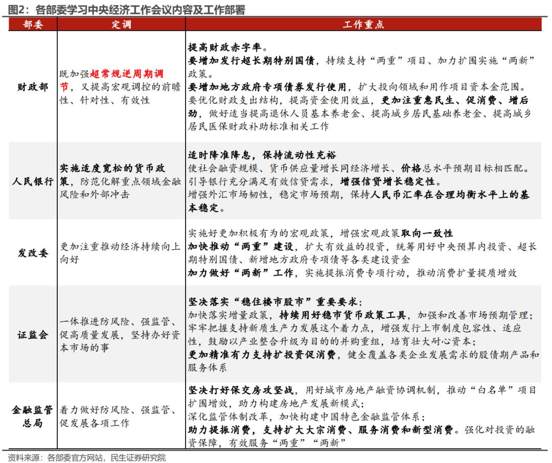 首先,“超常规”的短期立意在于财政,而货币更多立足于逆周期调节。“超常规逆周期调节”在财政部学习会议中再次提及,印证了12月政治局会议的定调,明年赤字率、特别国债、专项债的数字规模就是“超常规”的具象体现。货币方面央行同时强调“适时降准降息”以及“保持人民币汇率基本稳定”,反映明年汇率的“步子”会依旧比较谨慎,依据财政力度和外部环境择时宽松可能是合适的节奏。