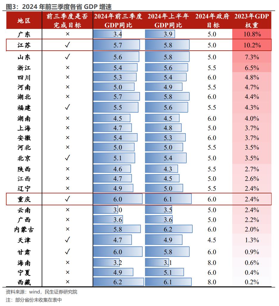 一是,江苏、重庆两地“迎难而上”,凭借今年的经济成绩与各自禀赋,主动领头示范“超常规”。地方中仅有江苏、重庆在明年工作中提及“超常规”。从数据上看,江苏今年前三季度GDP同比5.7%,为经济大省中增速最高,且外贸是其经济结构中的重要部分;重庆今年前三季度GDP同比6.0%,增速在31省市中仅次于体量较小的西藏,自身消费市场景气度高,今年前8个月社零增速持续高于全国水平。