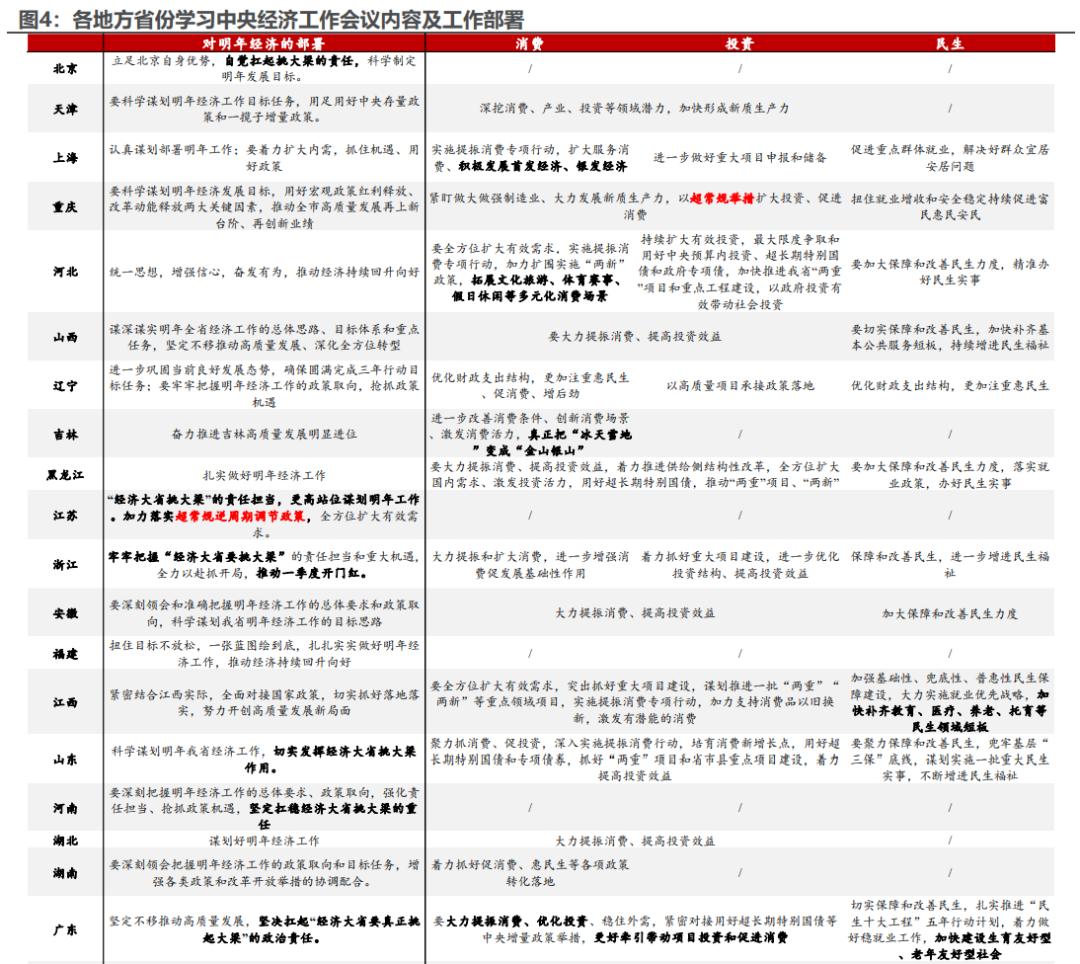 二是,各项工作“能早则早、抓紧抓实”。一方面体现为。GDP前六的省份均响应了“经济大省挑大梁”的责任担当,其中浙江,四川进一步明确了明年“开门红”的基调。另一方是,在明年外部不确定性加深的背景下,各地对于下好经济“先手棋”的共识尤为重要。