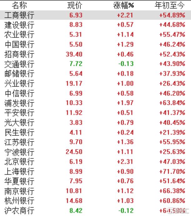截至发稿,工商银行涨超2%,农业银行、中国银行涨超1%,建设银行、招商银行、邮储银行微涨。