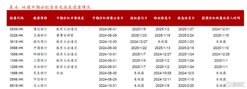 大部分H股将于明年分红派息,1月分红派息的H股有建设银行、渝农商行、邮储银行、工商银行、农业银行、中信银行。