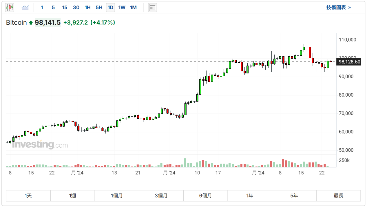 周三(25日),圣诞节,比特币 (BitfinexUSD)重拾升势,日内升超4%,站上9.8万美元上方。