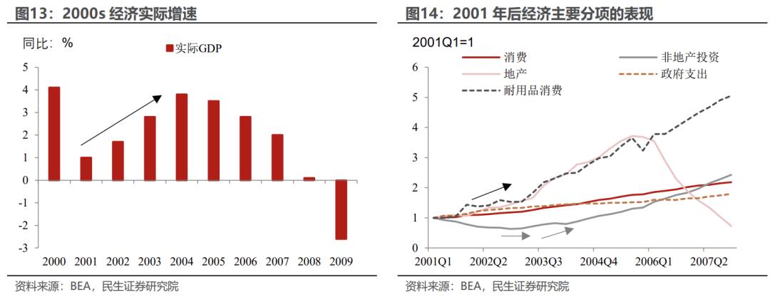 同时布什政府推出“居者有其屋”计划,旨在通过提供税收优惠、增加住房信贷供应等措施提高家庭住房拥有率。叠加2001年至2003年的大幅降息,经济享受了一波地产和消费的“红利”。