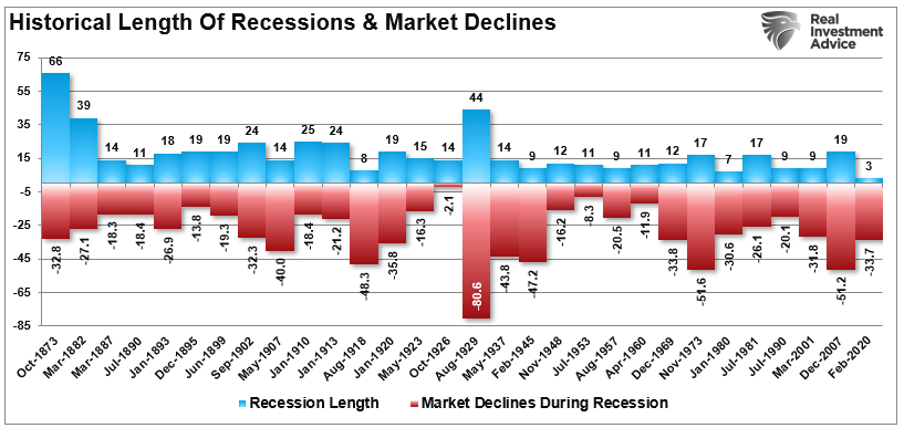 虽然牛市的持续时间较长有利于乐观派,但问题在于牛市终将结束,这是必然的。不过,如图所示,熊市以及随之而来的衰退通常都很短暂。大多数熊市持续时间不到18个月,虽然它们令人痛苦,但当市场价格上涨的势头回归时,人们往往会很快忘记它们。