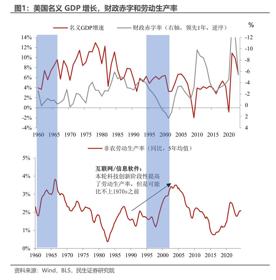 “赤字”和“技术”之争。我们主要观察1960s以来的历史,根据美国著名经济学家布林德(Alan Blinder)的研究,1962年美国政府才开始有意识地相机抉择使用财政政策进行总需求调控。当然也有例外,一个是1960s,另一个就是1990s,有趣的是这两个阶段都对应着较高的劳动生产率。