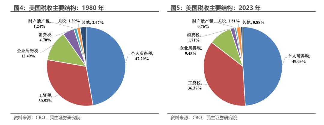共和党政府尤其热衷于减税,例如里根1981年和1986年减税,布什2001年和2003年减税,以及特朗普的2017年减税。这主要与美国税收以所得为主的特点有关,个人和企业所得超过50%。通过大幅调整所得税率确实有助于刺激居民和企业的支出行为。除此之外,早期还会调整资本利得和遗产税。