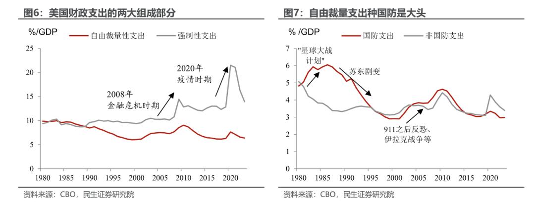 美国财政支出分为两大部分,由法律规定的强制性支出,由国会商议的自由裁量支出,2023年两者比例大致为2:1,是美国财政支出主要的增量来源。