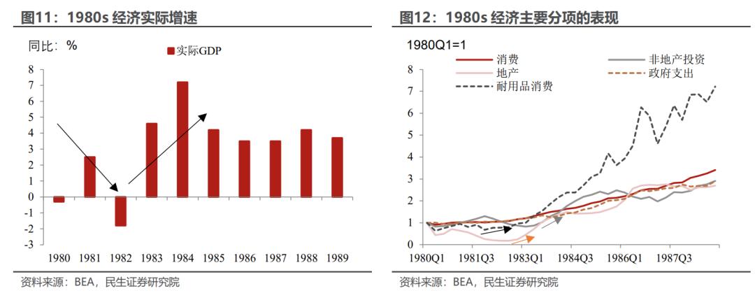 而经过1980年和1982年的经济衰退,通胀基本得到控制,美联储开始转向宽松。减税加宽松的金融货币环境,耐用品消费迎来“热潮”,地产也不差。