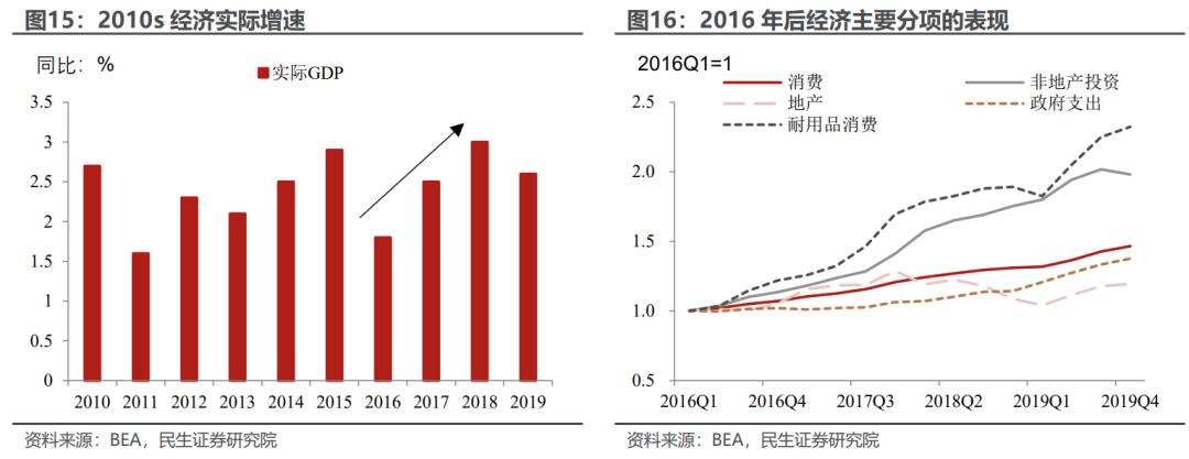 财政支出上并没有明显的扩张,赤字财政依旧主要依靠减税——大幅降低了居民个人所得税和企业所得税。由于居民依旧不愿意加杠杆,叠加美联储进入紧缩周期,地产不强,主要依靠耐用品消费和非地产投资,经济出现了比较温和的反弹,不过在2018年全球经济明显放缓的背景下,依旧显得难能可贵。