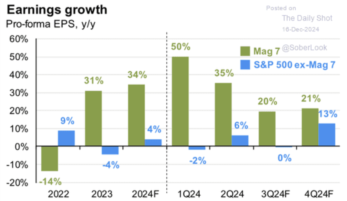 对2025年的乐观情绪还出现了一种有趣的转变。此前两年,增长高于平均水平的盈利回报仅来自标准普尔500指数中市值排名前7的公司。然而,分析师现在预计盈利增长将转向指数中排名后493的公司。