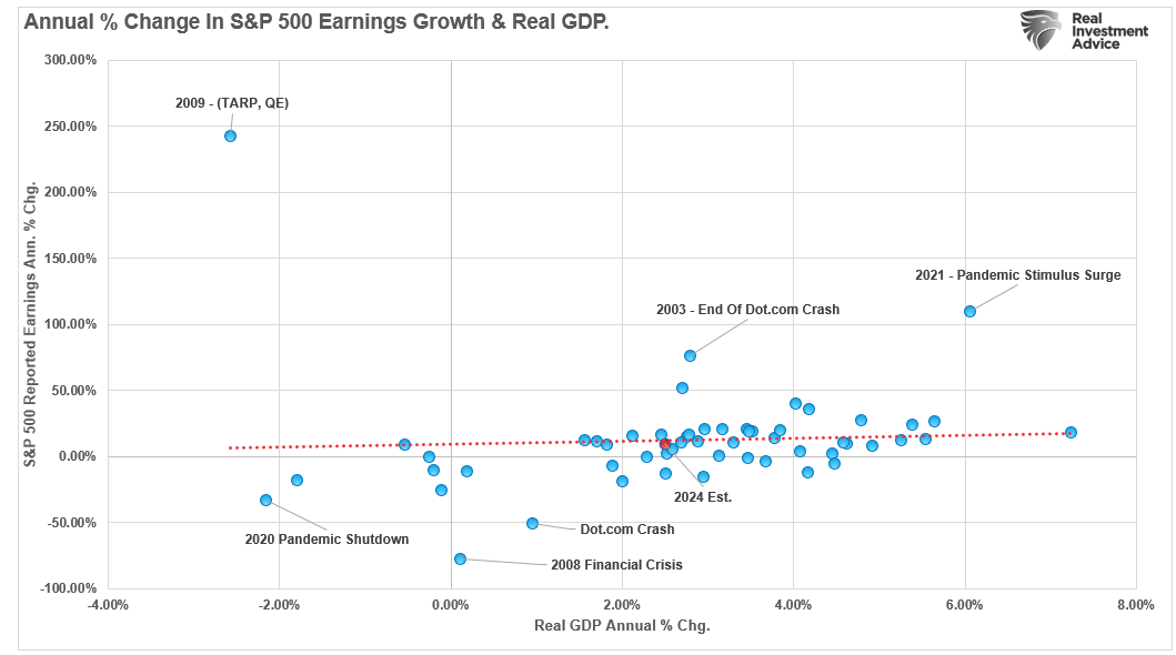 然而,尽管分析师对2025年盈利增长情况非常乐观,他们预期的盈利增速远超长期增长趋势,不过这种美好的期望已经开始向现实回归。过去六个月,分析师的预期每股收益已下调3美元,到2025年可能会更接近220美元。如数据所示,盈利通常不会长时间偏离长期趋势,偏离通常只发生在经济衰退和随后的快速复苏期间。
