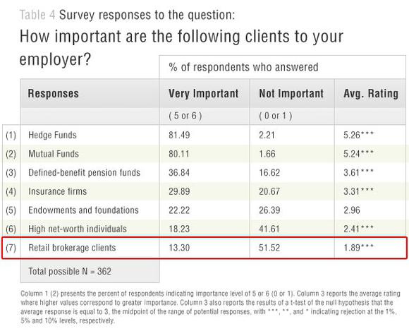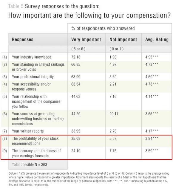 下图来自研究人员的调查,显示了影响分析师薪酬的主要因素。分析师“为了薪酬”所做的工作与散户投资者“认为”他们做的工作大相径庭。