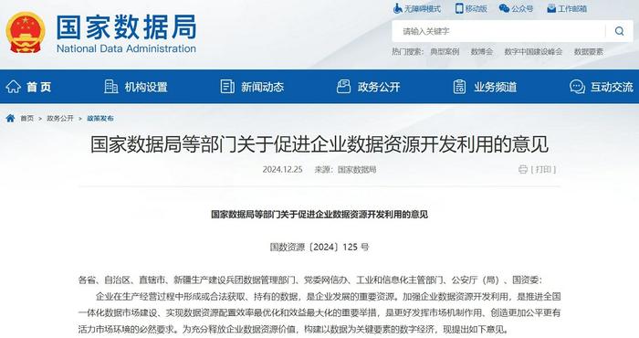 12月25日,国家数据局等部门发布《关于促进企业数据资源开发利用的意见》(以下简称《意见》)。其中提出,以深化数据要素市场化配置改革为主线,以激发企业创新活力为关键,以健全企业数据权益实现机制为重点,充分发挥企业主体作用,分类推进企业数据资源开发利用,提升企业竞争力,赋能产业数字化转型,助力提升治理效能和公共服务能力,为培育新质生产力、推动高质量发展提供有力支撑。