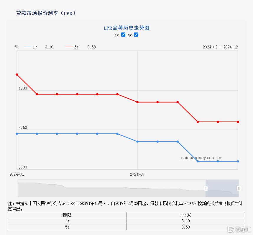 据中国人民银行授权全国银行间同业拆借中心公布,2024年12月20日贷款市场报价利率(LPR)为: