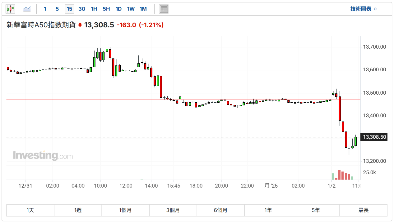 周四(2日),中国股市年内首个交易日下跌,A股三大指数均跌超1%。富时中国A50指数期货短线跳水逾200点,日内跌幅达1.21%。
