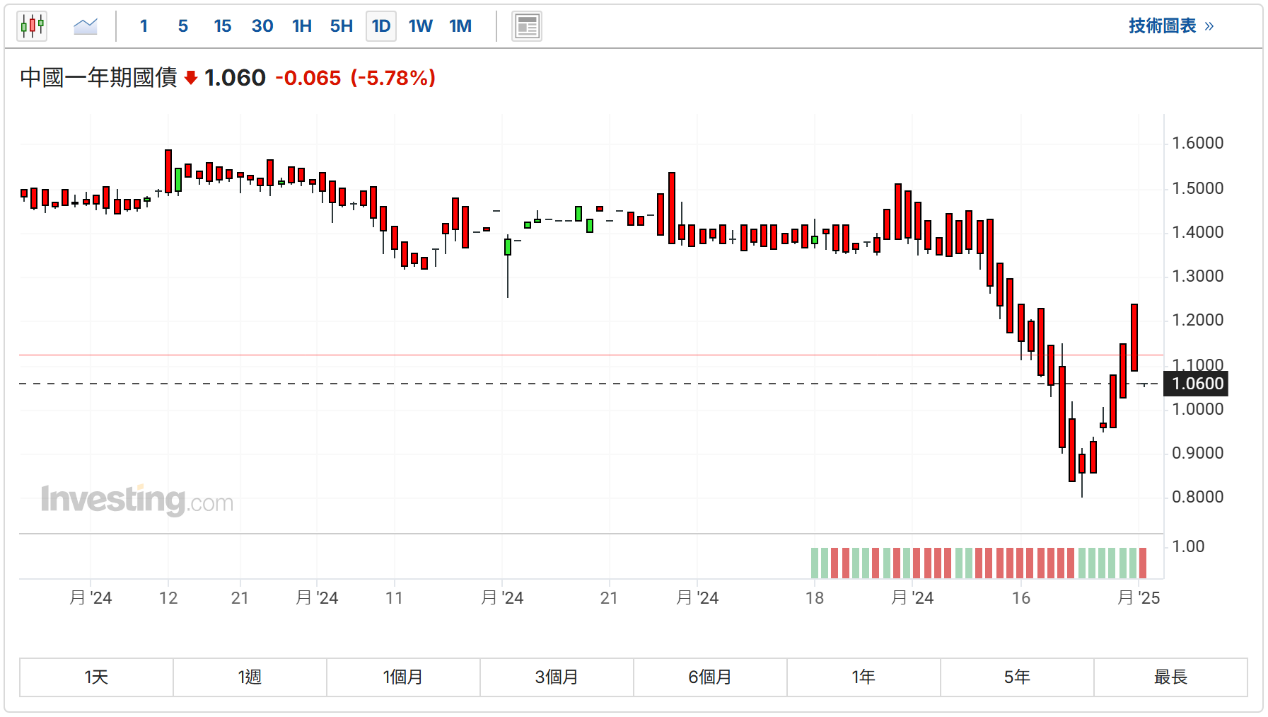 中国一年期国债收益率大跌近6%。