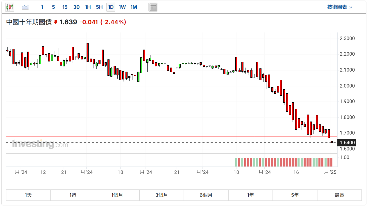 中国十年期国债收益率跌至1.639,刷新历史低位。