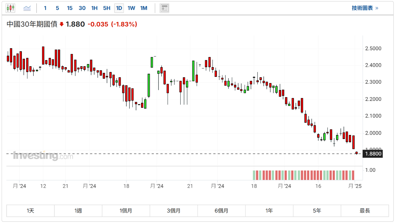 中国30年期国债收益率跌至1.88,创纪录新低。