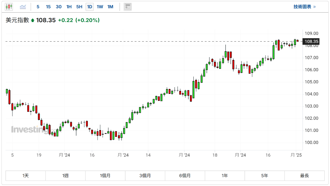周四(2日),美元指数周二升至108.58,创2022年11月以来最高,2024年美元指数全年上升了6.6%。