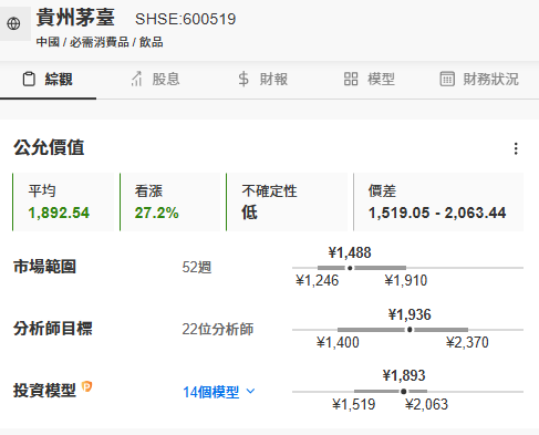 当前,InvestingPro估值模型看涨茅台27%,分析师更是高看至1936元人民币。