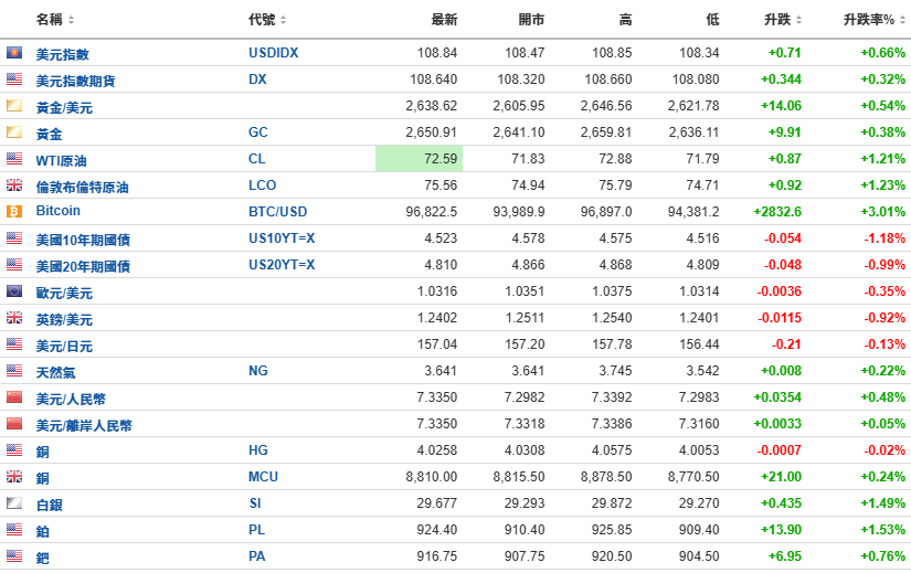 加密货币概念股上升,比特币升破9.68万美元。Marathon Patent(NASDAQ:MARA)升4.5%,Riot Blockchain(NASDAQ:RIOT)升4%,Bit Digital Inc (NASDAQ:BTBT)升5%,Coinbase Global Inc (NASDAQ:COIN)升4%。