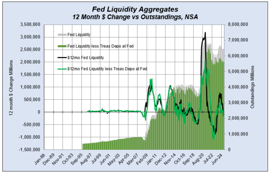 我们现在来看看几张有关上述看法的图表,首先是Michael Pollaro绘制的图表,到2024年,流动性一直在上升,从美联储的各种渠道流出,惟后来又回落了。