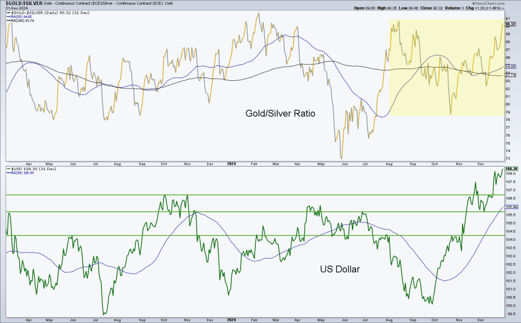 另一个危险信号是两位「流动性末日骑士」美元和金银比,