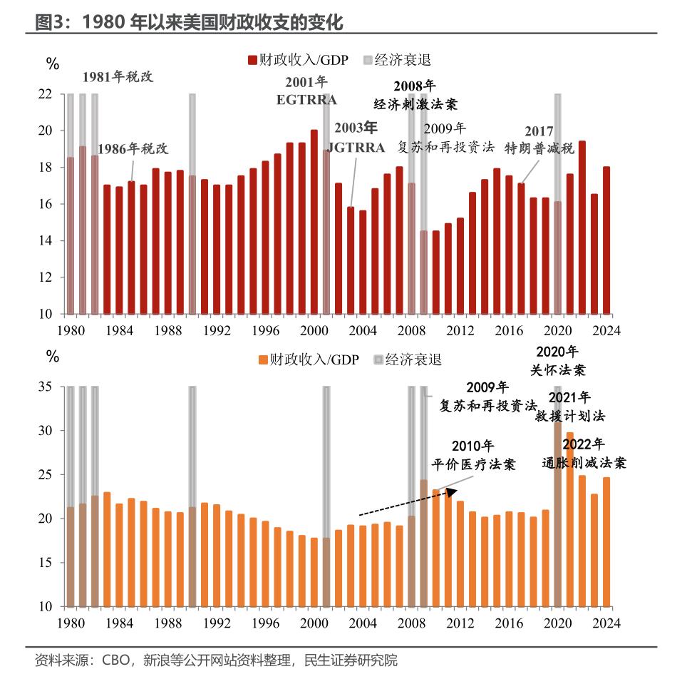 共和党政府尤其热衷于减税,例如里根1981年和1986年减税,布什2001年和2003年减税,以及特朗普的2017年减税。这主要与美国税收以所得为主的特点有关,个人和企业所得超过50%。通过大幅调整所得税率确实有助于刺激居民和企业的支出行为。除此之外,早期还会调整资本利得和遗产税。