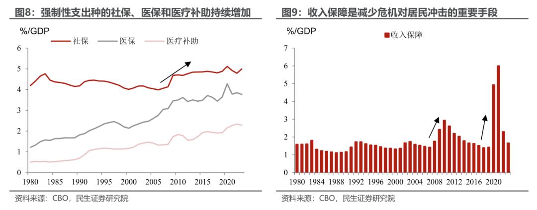 强制性支出聚焦民生,尤其值得注意的是2008年金融危机后,社保支出力度明显上升。另一个“秘密武器”是,这是美国政府缓解经济衰退和外部冲击对个人、家庭造成负面影响的重要手段,其中包括失业补偿、补充性保障收入、儿童税收抵免、补充性营养支持计划等。