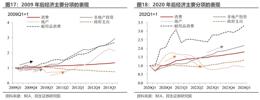 刺激经济,谁的力量最大?纵观1980年以来的历史,财政花钱刺激后,消费始终是美国经济最有韧性的部分、在居民能够加杠杆的阶段下,也会伴随着消费一起反弹,然后才是非地产的制造业投资;而2008年后,美国居民进入去杠杆阶段,地产投资的反弹的速度、可持续性和幅度都要弱于制造业投资: