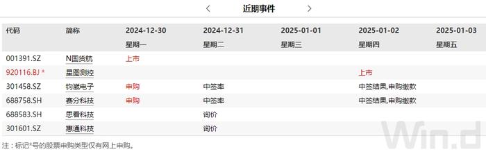 Wind数据显示,本周(12月30日-1月3日)将有2只新股发行,其中创业板有1只,合计发行约1.17亿股,预计合计募资20.51亿元。具体来看,12月30日发行的是赛分科技、钧崴电子。此外,本周还有1只新股——N国货航上市。